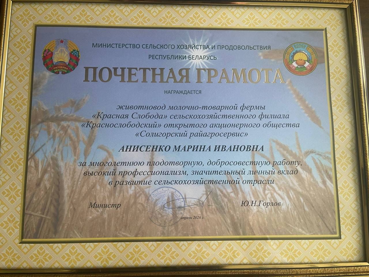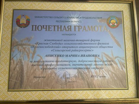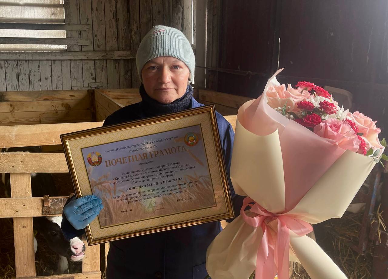 Животновод Марина Анисенко отмечена высокой наградой. За многолетнюю плодотворную, добросовестную работу, высокий профессионализм, значительный вклад в развитие сельскохозяйственной отрасли она удостоена Почётной грамоты Министерства сельского хозяйства и продовольствия Республики Беларусь.