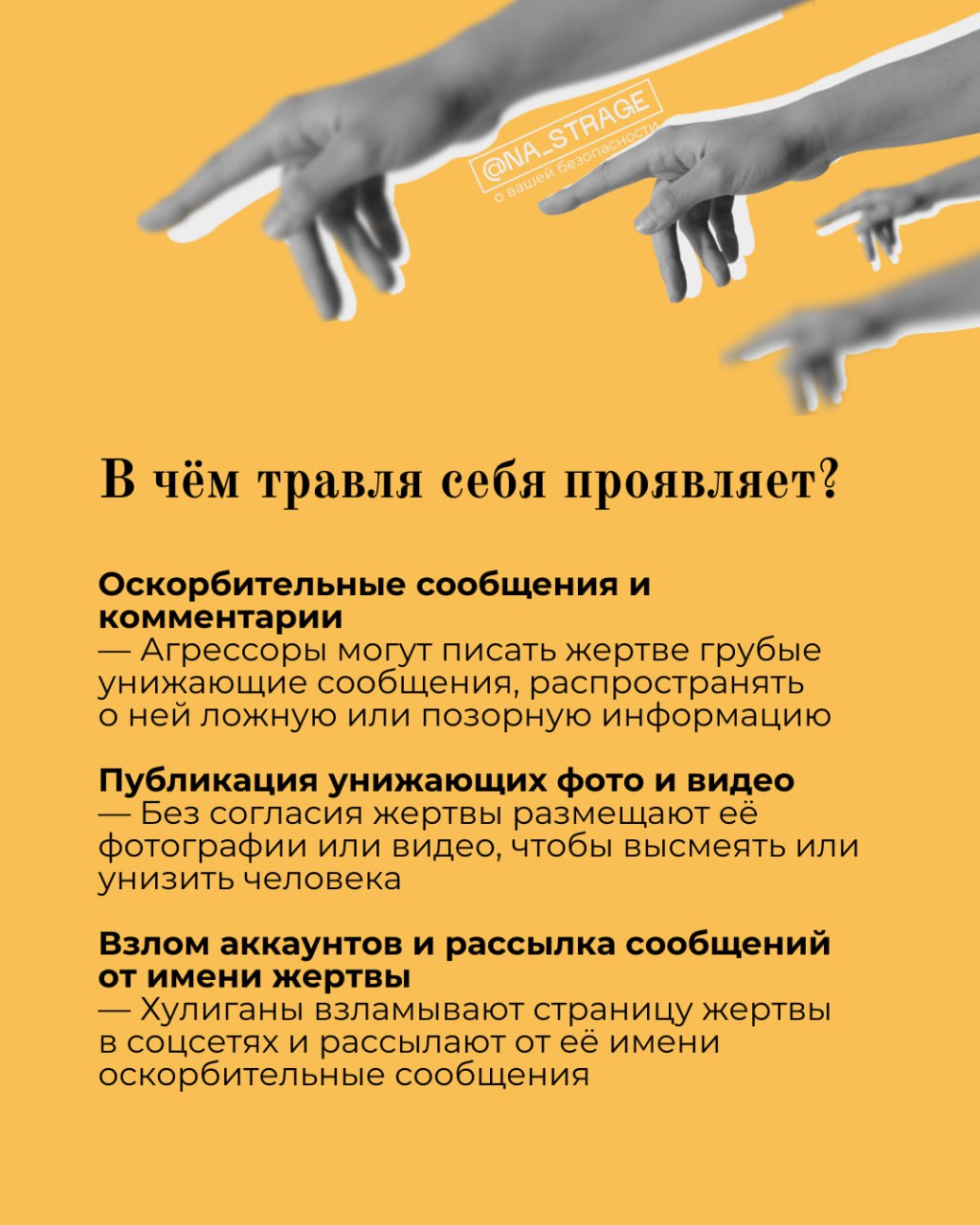 Оскорбительные сообщения и комментарии. Агрессоры могут писать жертве грубые унижающие сообщения, распространять о ней ложную или компрометирующую информацию.