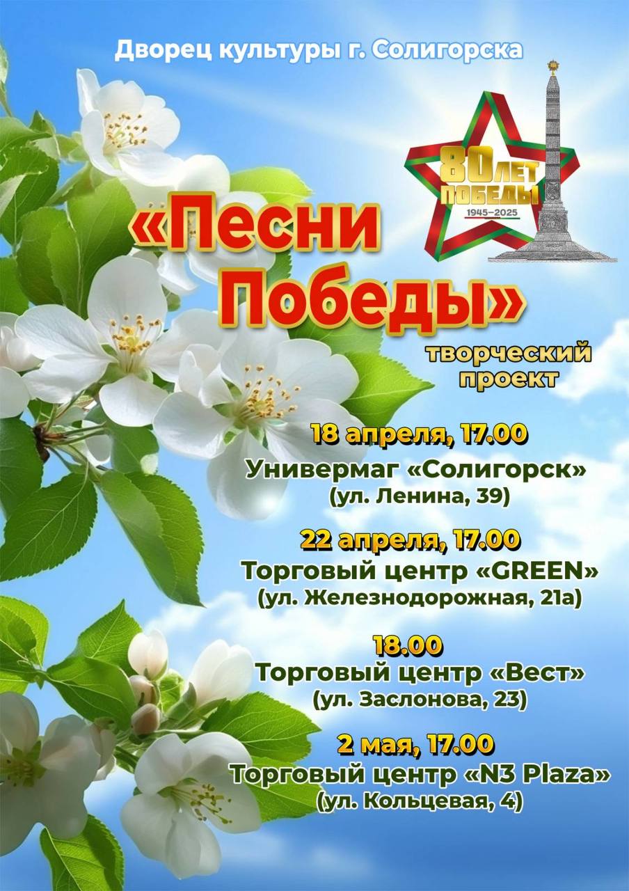 В преддверии 80-й годовщины Победы советского народа в Великой Отечественной войне ГУ «Дворец культуры г. Солигорска» реализует проект «Песни Победы», который включает в себя исполнение песен военной тематики на производственных площадках предприятий, организаций, торговых центрах Солигорского района.