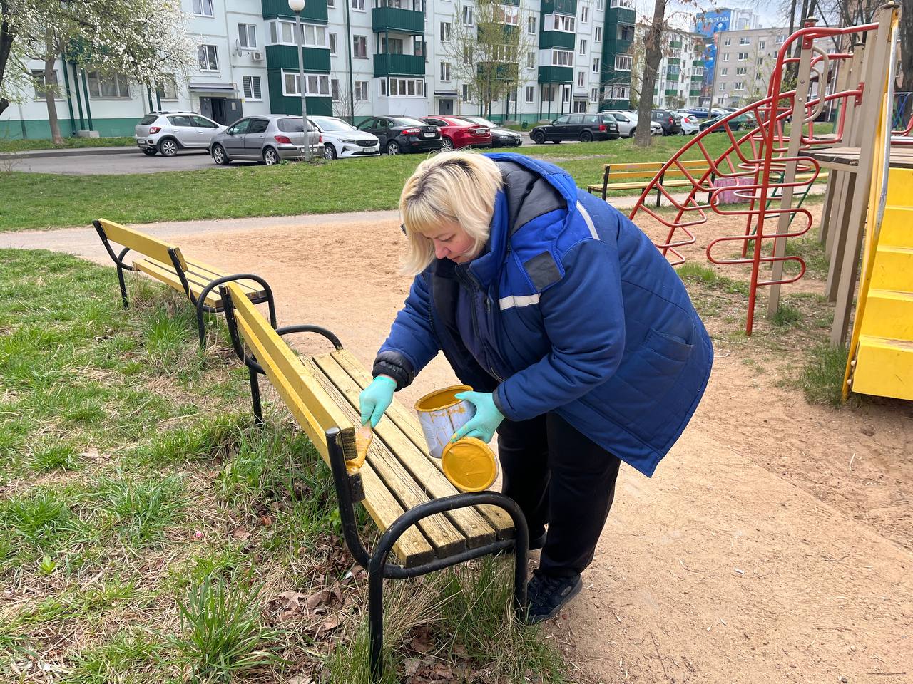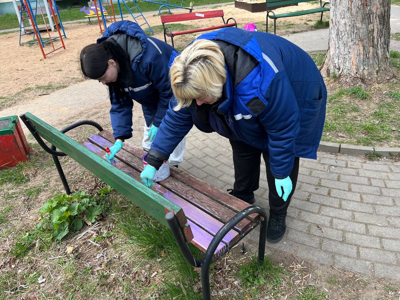 Сегодня ЖЭС №1 активно взялся за благоустройство территории: уборка листьев и окрашивание скамеек и детских площадок проходит во дворах на улице Л.Комсомола, 7 и 9.