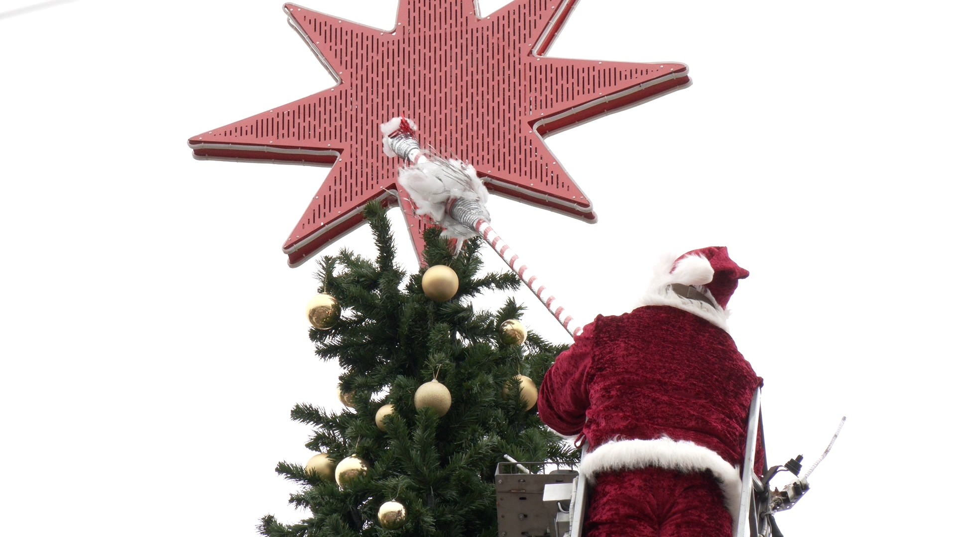 Иллюминацию на елочке-красавице зажег необычный Дед Мороз, поднявшись к ее верхушке при помощи пожарной автолестницы.