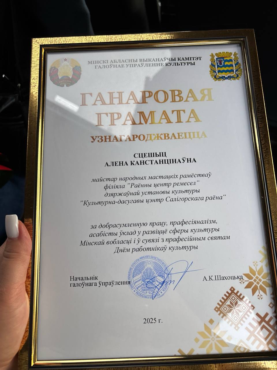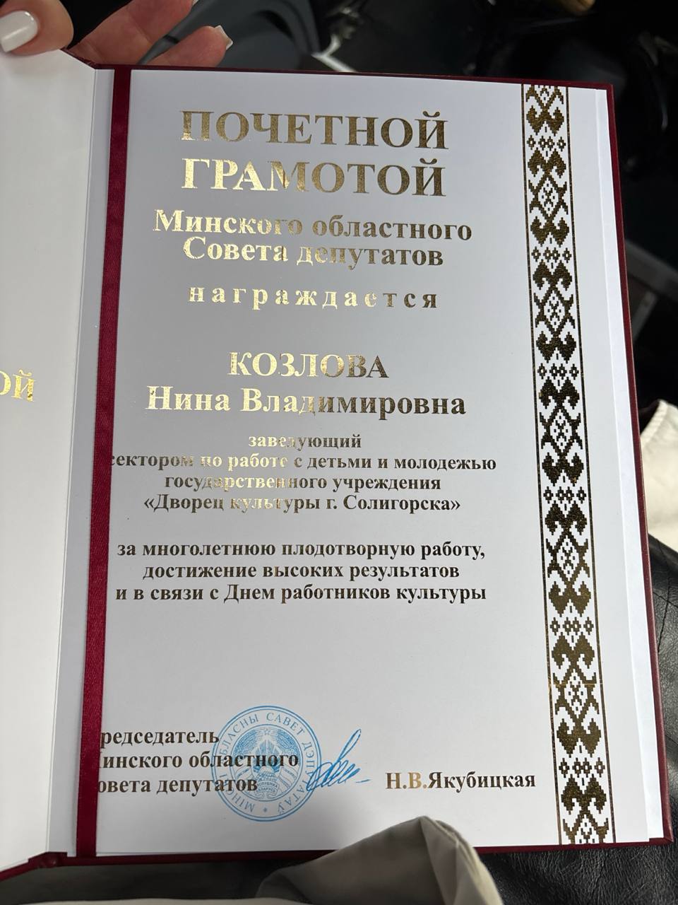 Почетной грамотой главного управления культуры Минского областного исполнительного комитета награждена: