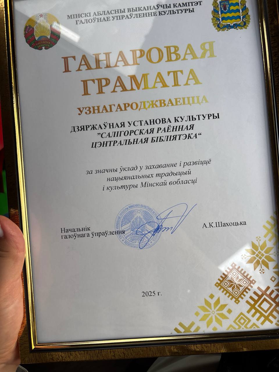 Почетной грамоты главного управления культуры Миноблисполкома удостоена и Солигорская центральная районная библиотека.