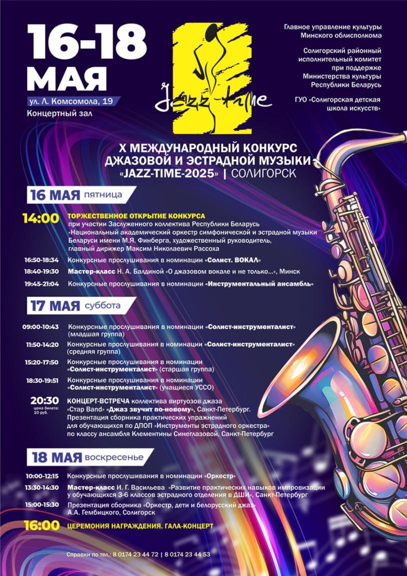 С 16 по 18 мая 2025 года в г. Солигорске Минской области (Республика Беларусь) в очередной раз состоится IX Международный конкурс джазовой и эстрадной музыки «JAZZ-TIME 2025».
